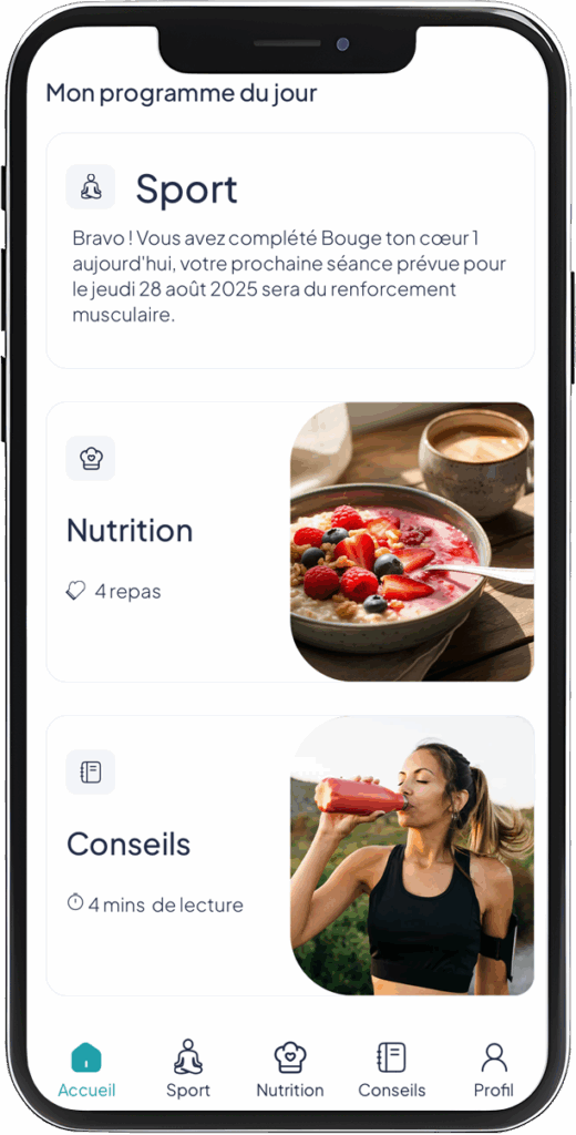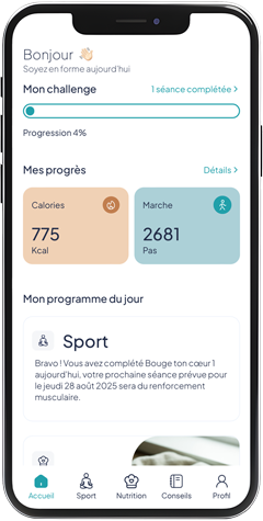 - Accès à l’ensemble des contenus : programmes nutrition et sport sur-mesure, conseils