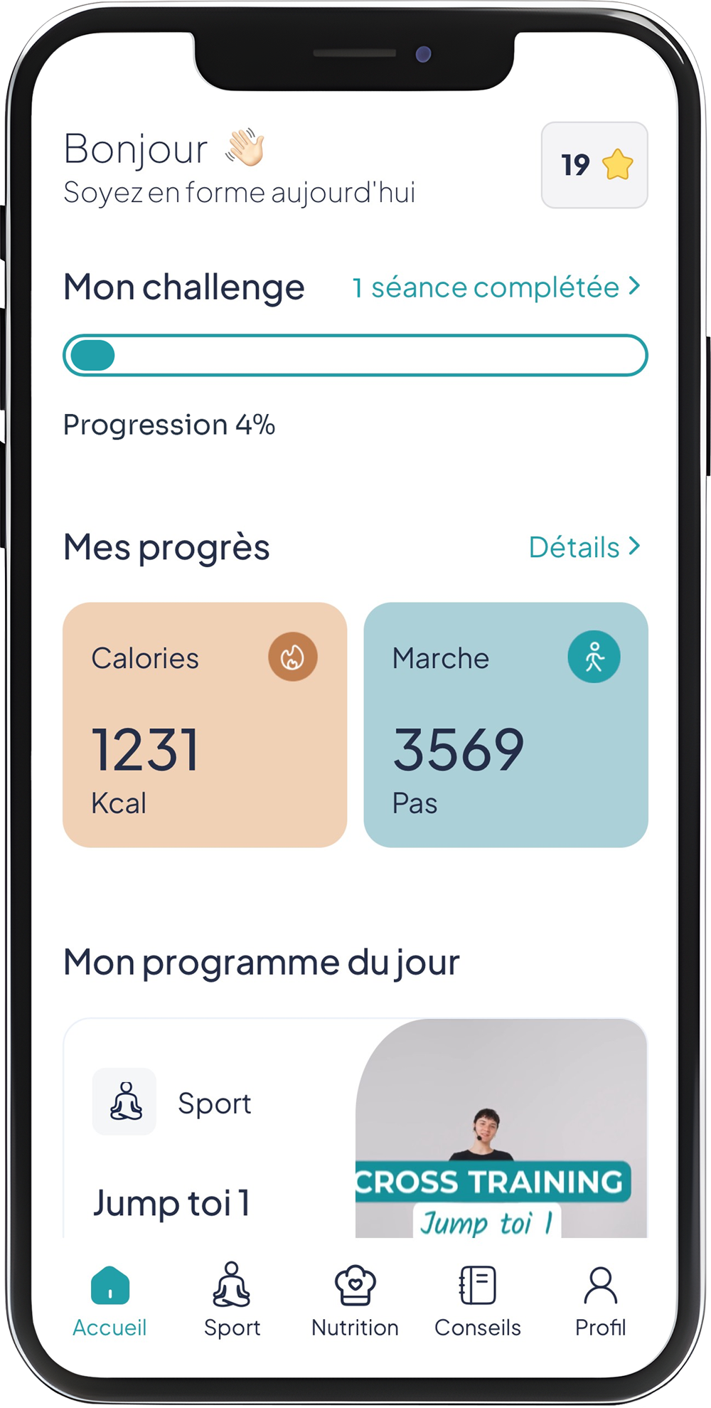 - Accès à l’ensemble des contenus : programmes nutrition et sport sur-mesure, conseils